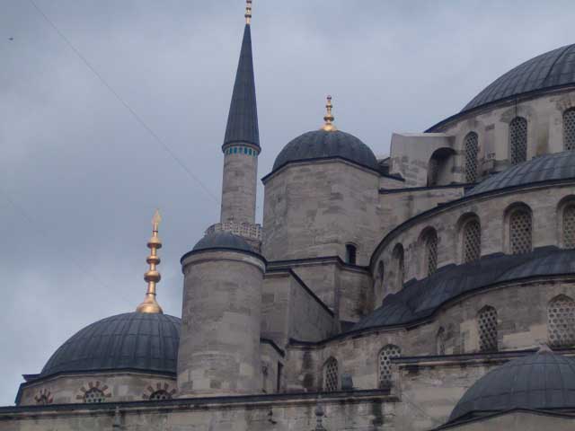 The Blue Mosque of Istanbul with its six minarets towering over the the Sea of Marmara and the Bosphorus is one of the first sights a cruise ship passenger will see when sailing into Istanbul from the Mediterranean Sea. The Blue Mosque was built from 1610-1619 under Sultan Ahmed I. With the unusual number of six minarets and a great cascade of domes and semi-domes, which billow heavenward towards the mosque's great dome, the Blue Mosque is a magnificent example of Islamic architecture. (Location: Istanbul)